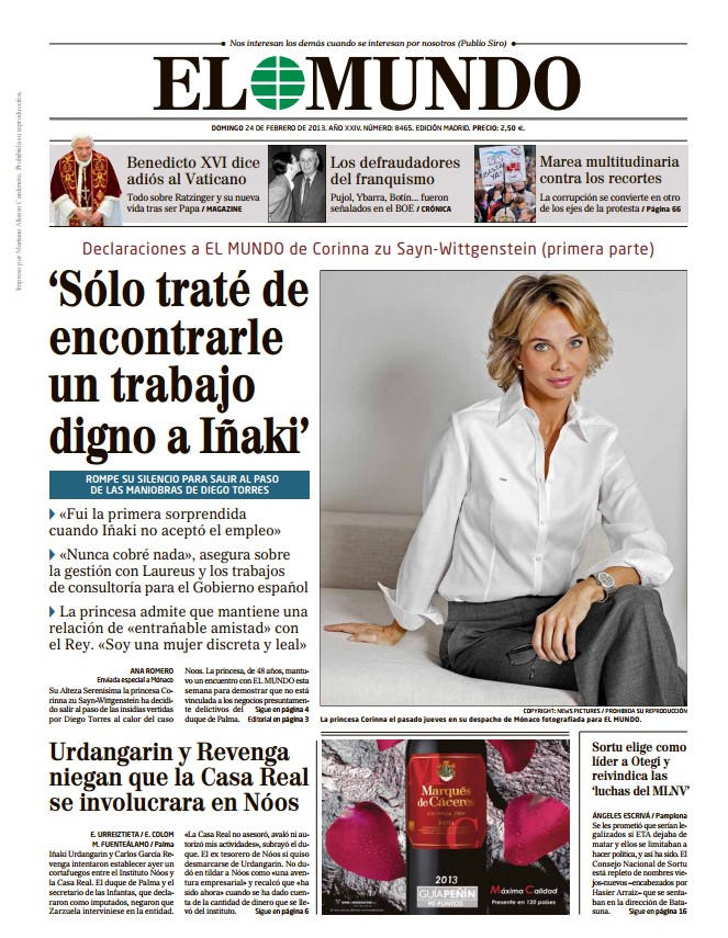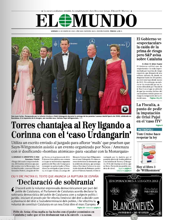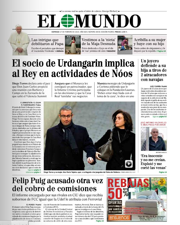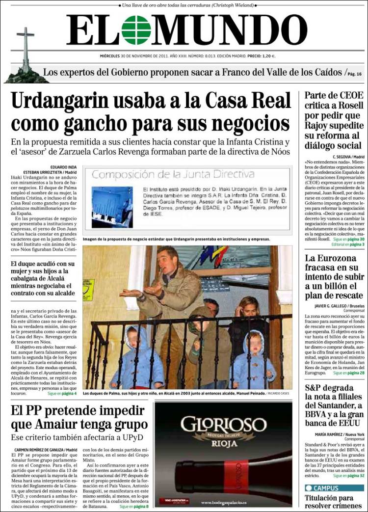El escándalo Nóos ha protagonizado muchas portadas y exclusivas en el diario desde que El Mundo lo destapó. En esta, de 2011, se destacaba cómo el duque se hacía valer de su condición de miembro de la Familia Real para hacer negocios. Lo acompañaban de una elocuente imagen: la de él y su familia en la cabalgata de Alcalá, donde también buscaba contratos.