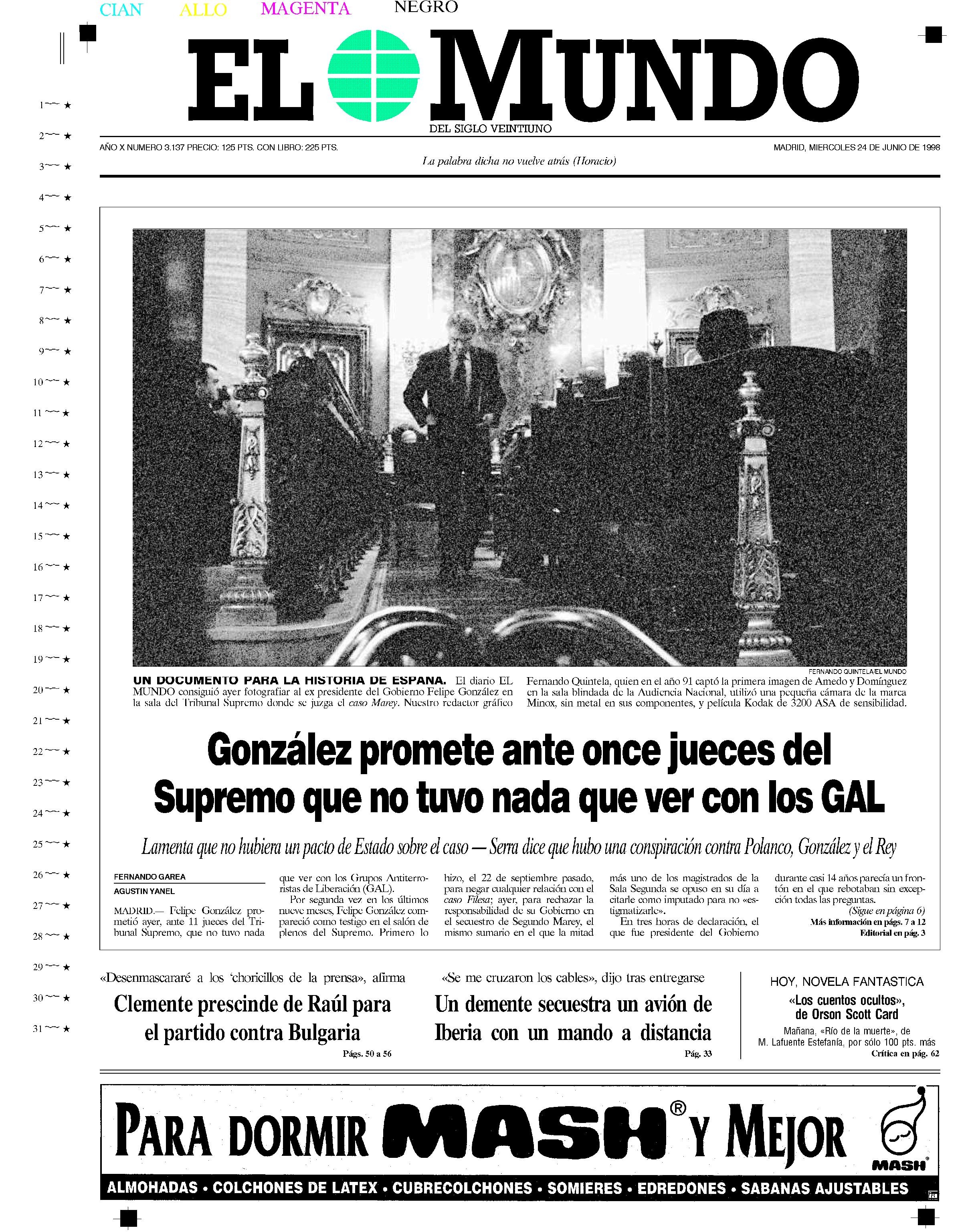 El diario El Mundo consigue la fotografía del presidente del Gobierno Felipe González declarando ante los jueces del Tribunal Supremo por los GAL.