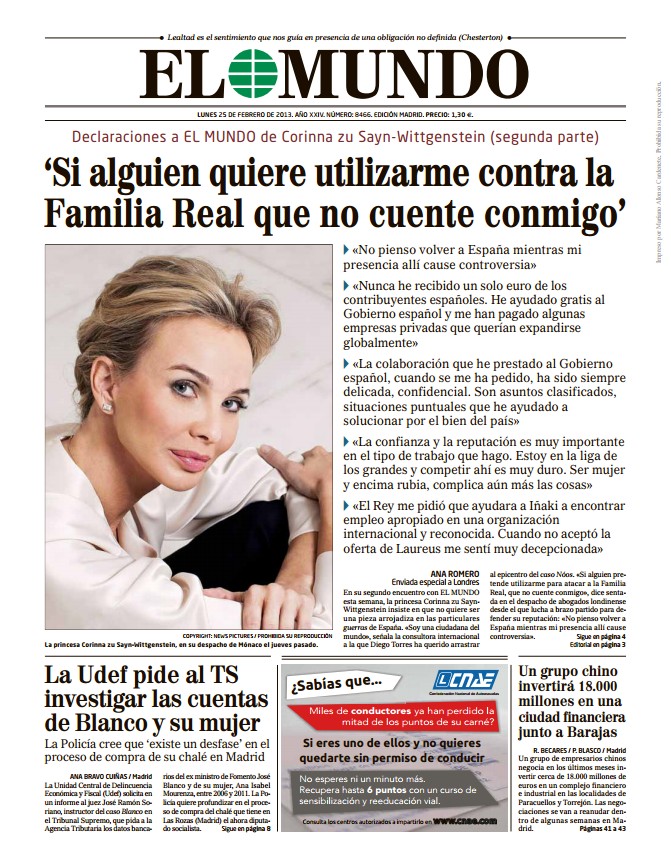 El diario El Mundo consigue una entrevista con Corinna zu Sayn-Wittgenstein, la entrañable amiga del Rey.