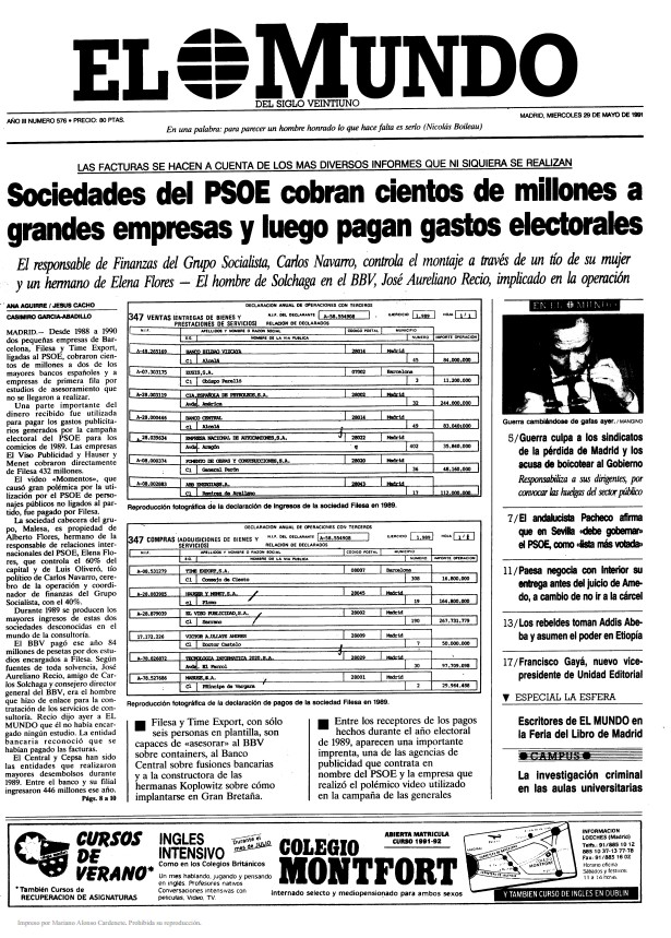 El diario El Mundo desvelaba que "sociedades del PSOE cobran cientos de millones a grandes empresas y luego pagan gastos electorales". Advertía de que "las facturas se hacen a cuenta de los más diversos informes que ni siquiera se realizan".