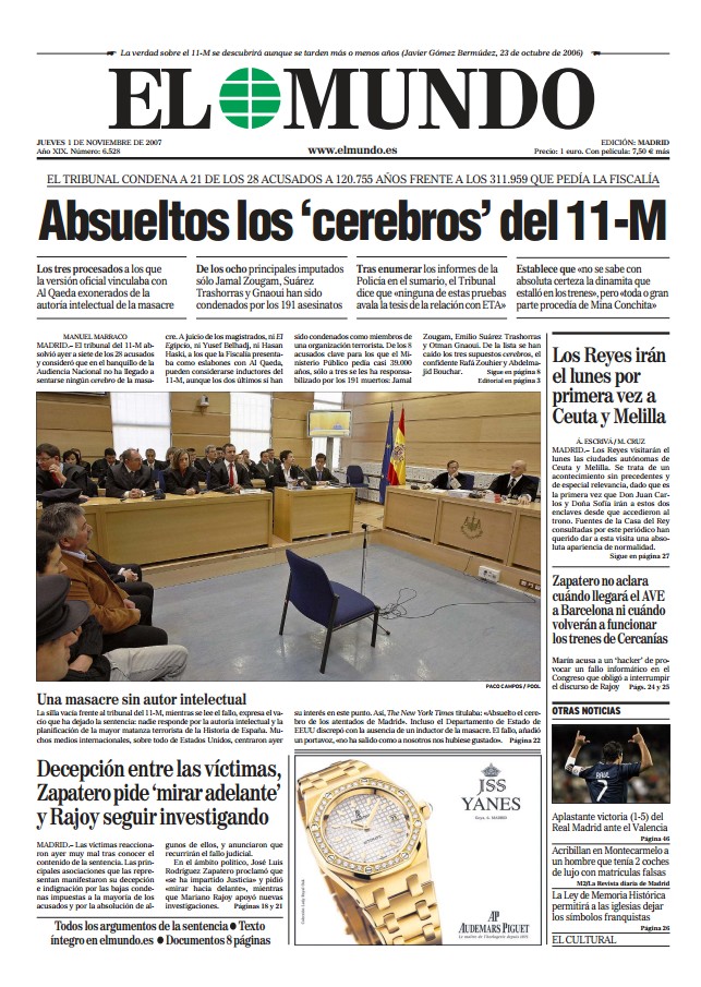 El diario El Mundo recoge la mayoría de los agujeros negros del 11-M en su información sobre la absolución de "los cerebros del 11-M".