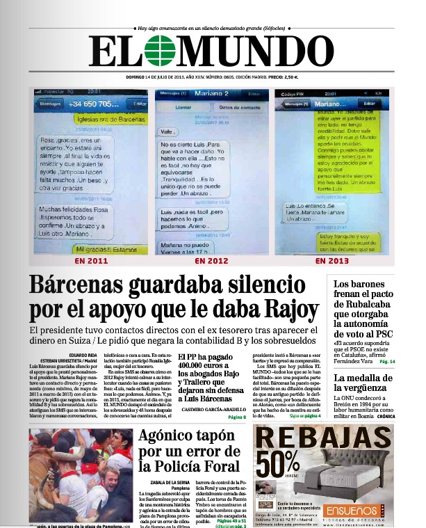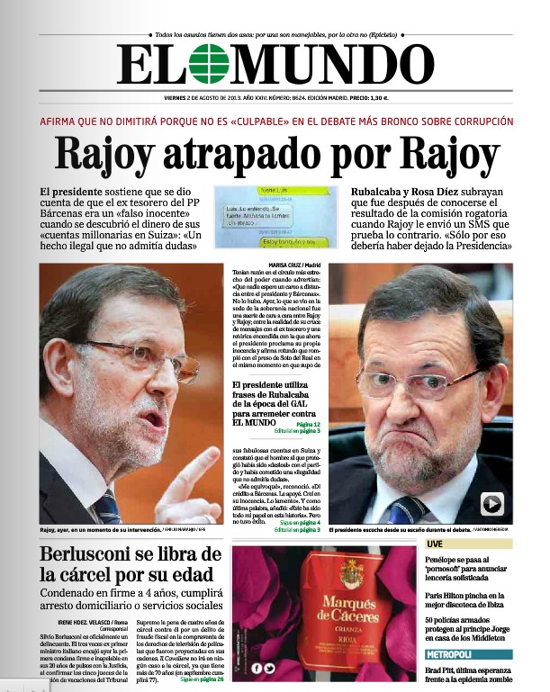 El Mundo da cuenta de la sesión parlamentaria en la que Rajoy dijo haberse equivocado con Bárcenas y en la que "el presidente" sostuvo que "se dio cuenta de que el extesorero del PP era un falso inocente cuando se descubrió el dinero de sus cuentas millonarias en Suiza". Como recordó El Mundo en su información "Rajoy atrapado por Rajoy", el presidente utilizó una frase de Rubalcaba de la época de los Gal para arremeter contra El Mundo.