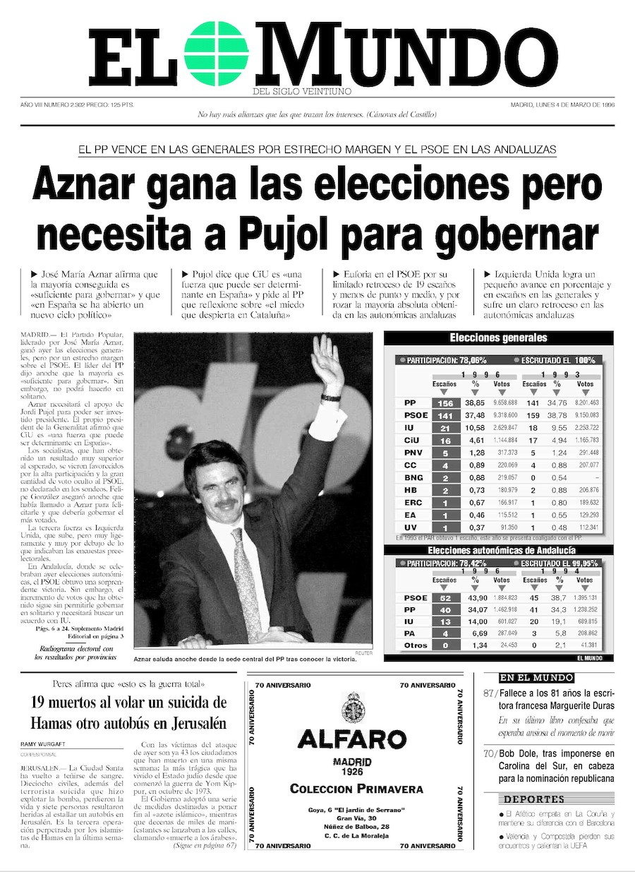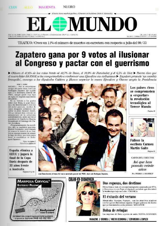 José Luis Rodríguez Zapatero protagoniza un cambio histórico en el PSOE al ganar por 9 votos el congreso del partido "y pactar con el guerrismo", decía El Mundo.