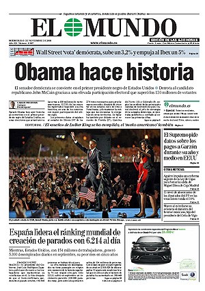 El candidato demócrata a las elecciones de raza negra, Barack Obama, "hace historia" al convertirse en el primer presidente afroamericano de los EEUU.