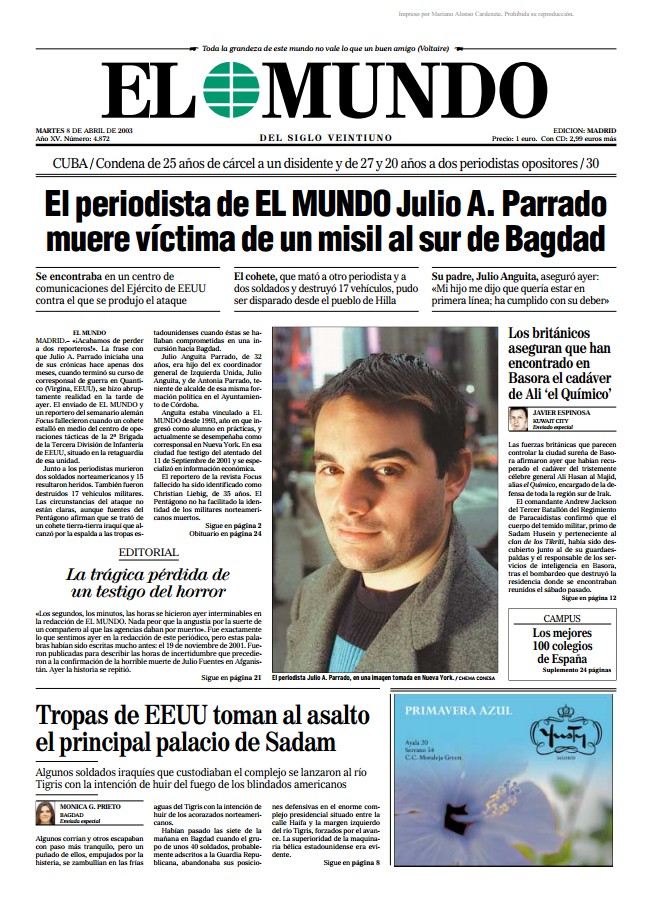 "El periodista de El Mundo Julio A. Parrado -hijo del histórico dirigente de IU Julio Anguita- muere víctima de un misil al sur de Bagdad".