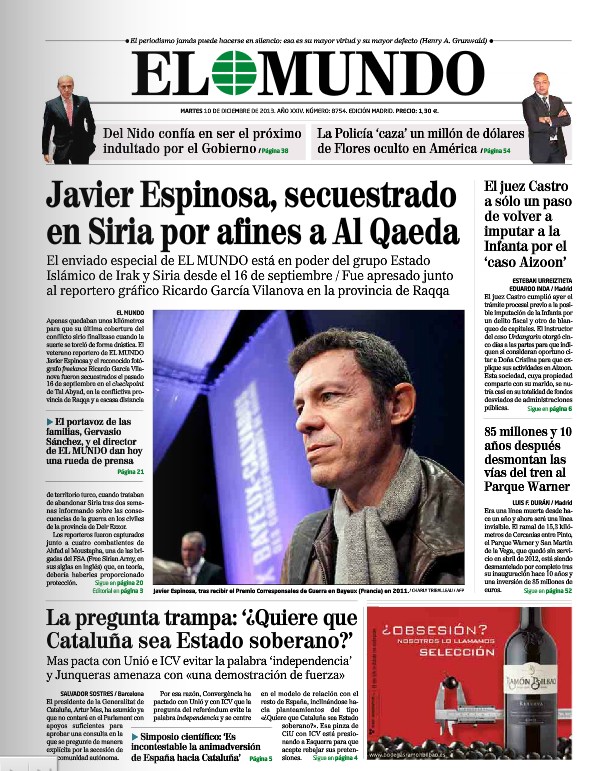 El periodista Javier Espinosa, "secuestrado en Siria por afines a Al Qaeda". Precisamente que Javier aún no esté de vuelta en España y de regreso a la redacción de El Mundo es algo de lo que más, ha confesado Pedro J., le ha "jodido" de su cese como director de El Mundo. Periódico del que le hubiera gustado seguir siendo el director para recibir a Espinosa.