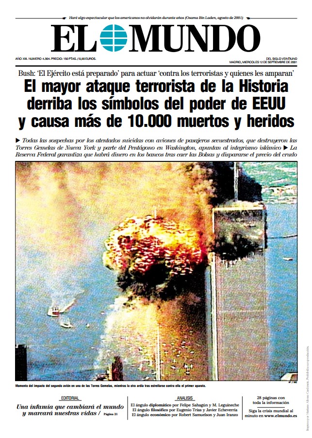 Portada del diario El Mundo el día después del mayor ataque terrorista sufrido por EEUU.