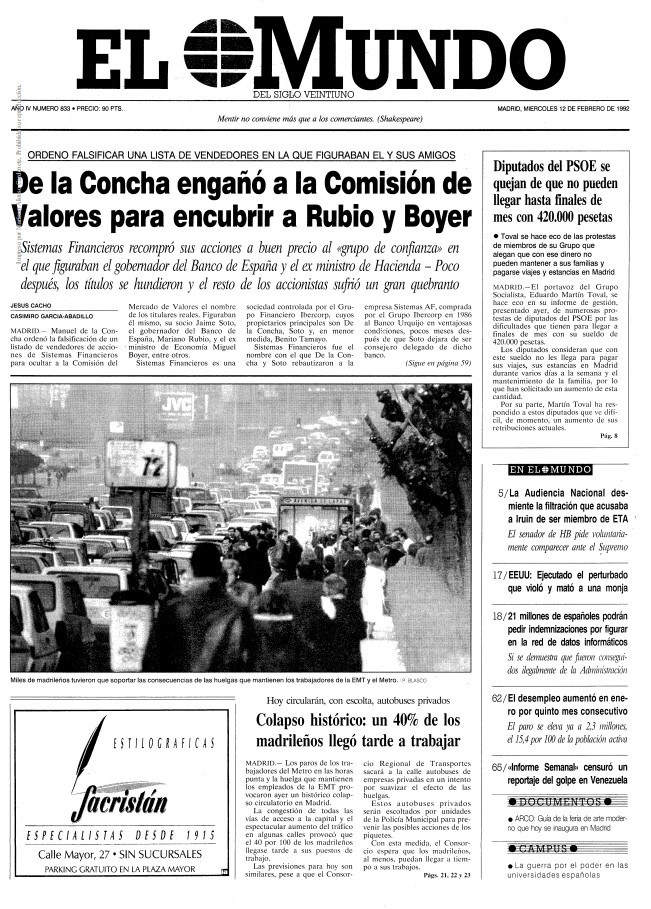 El Mundo publica su entrevista con Luis Roldán. Su titular: "No me van a engañar como a Amedo; si voy a la cárcel, no iré yo solo". Bajo el titular del ejemplar de aquel día, la imagen que recogía el diario con un Luis Roldán abatido.