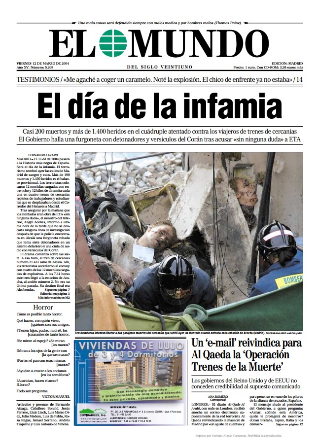 El día después del mayor ataque terrorista de la historia de España, El Mundo abría su edición con una crónica de Fernando Lázaro titulada "el día de la infamia".