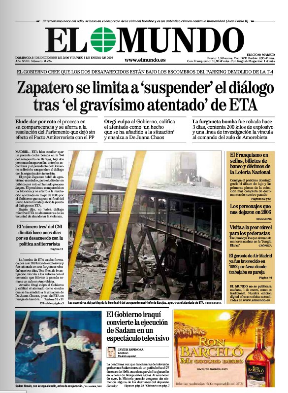 ETA vuela la T4 de Barajas el día después de que Zapatero prometiera que estaríamos mejor en materia antiterrorista. El Mundo destacaba que "Zapatero se limita a suspender el diálogo tras el gravísimo atentado de ETA".