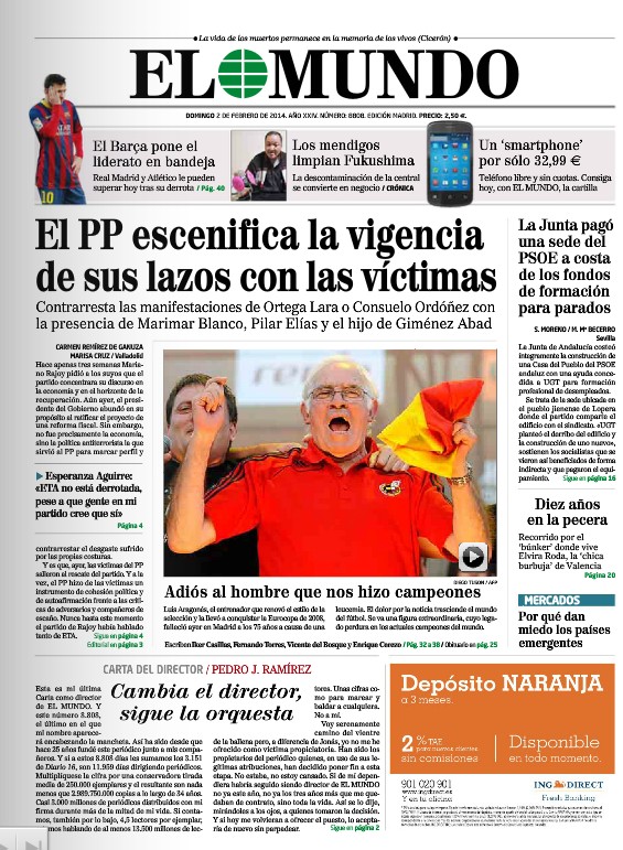 Última portada del diario El Mundo bajo la dirección de Pedro J. Ramírez. Según pudo saber esRadio, hasta la redacción acudieron el sábado por la tarde sesenta redactores que quisieron acompañar a su director en el montaje de su última portada.