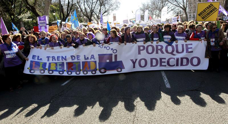 Miles de personas se han sumado a la marcha convocada en Madrid por el llamado 'Tren de la libertad', una caravana de manifestantes para pedir la derogación de la Ley de Salud Sexual e Interrupción Voluntaria del Embarazo y la dimisión del ministro de Justicia, Alberto Ruiz-Gallardón.