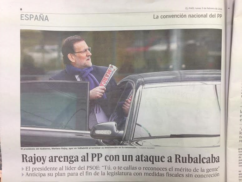 Una fotografía del presidente del Gobierno a la salida de la convención nacional del PP está provocando las iras y mofas en las redes sociales. La instantánea, publicada este lunes en El País, retrata a Mariano Rajoy momentos antes de entrar al coche, con el diario Marca en las manos, lo cual ha suscitado muchos comentarios en Twitter.