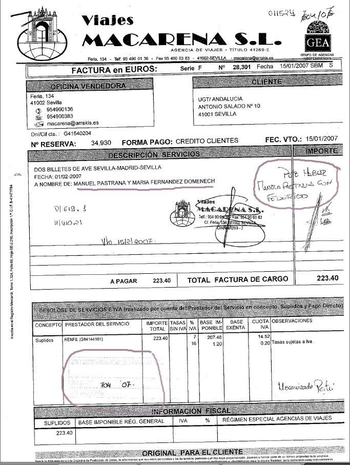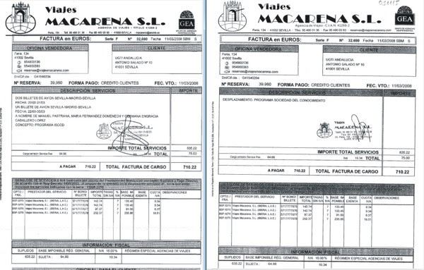 Como puede comprobarse, la pareja Pastrana-Domenech y la esposa de Zarrías, con cargo a UGT Andalucía, encargan los billetes a Viajes Macarena, ida y vuelta.
