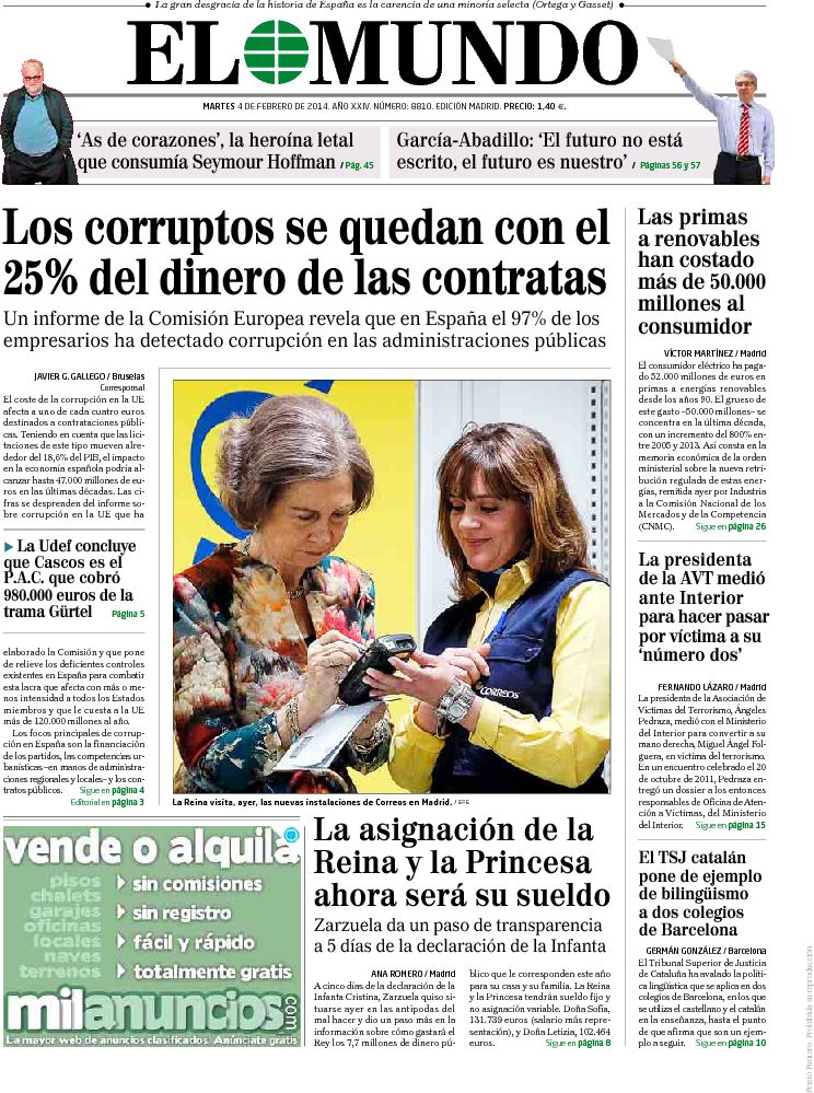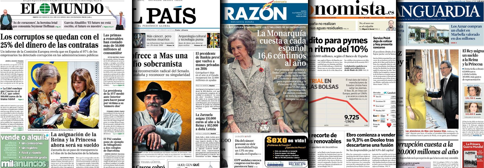 Portadas de los diarios El Mundo, El País, ABC, La Razón, La Vanguardia, El Periódico, Cinco Días, El Economista, Expansión, Marca, As, Mundo Deportivo y Sport.