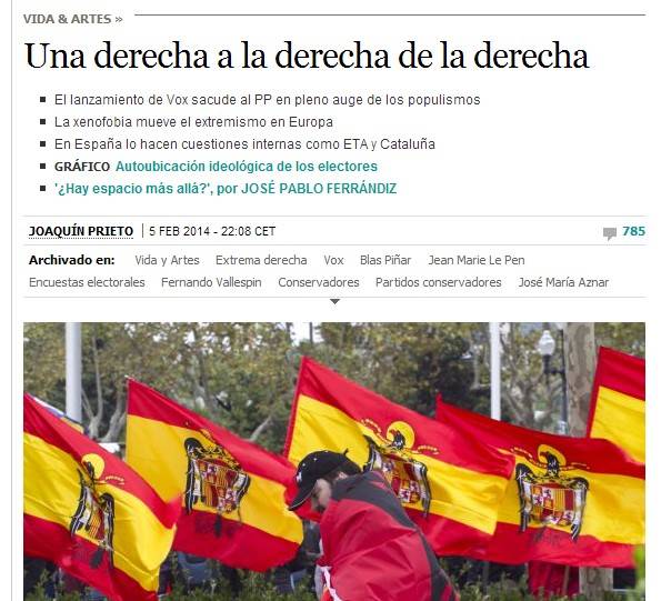 En el artículo, se señala que sus políticas se remiten a "cuestiones siempre ulceradas", como el separatismo y ETA, y aunque apunta que el partido no representa "vuelta alguna al fascismo", lo sitúa en medio de ejemplos como el Frente Nacional francés de Le Pen o Plataforma per Catalunya.