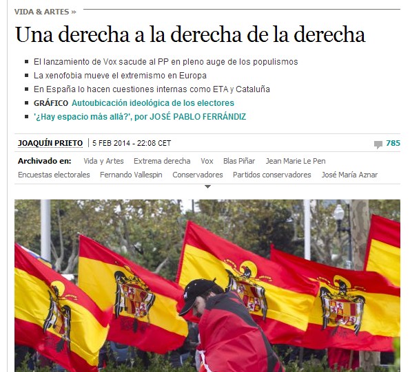 En la línea de las declaraciones de algún sector del PP, el diario de Prisa ha publicado este jueves un reportaje sobre el "auge de los populismos" que sitúa a Vox en la extrema derecha. Bajo el titular "Una derecha a la derecha de la derecha", el artículo trata de desprestigiar al partido político situando entre sus "antecedentes lejanos" a Blas Piñar. "Esa fuerza no puede haberse volatilizado totalmente, ni siquiera por razones biológicas", señala el periodista, que utiliza para ilustrar el reportaje una foto con banderas del águila de San Juan en el 12 de octubre de Barcelona.
