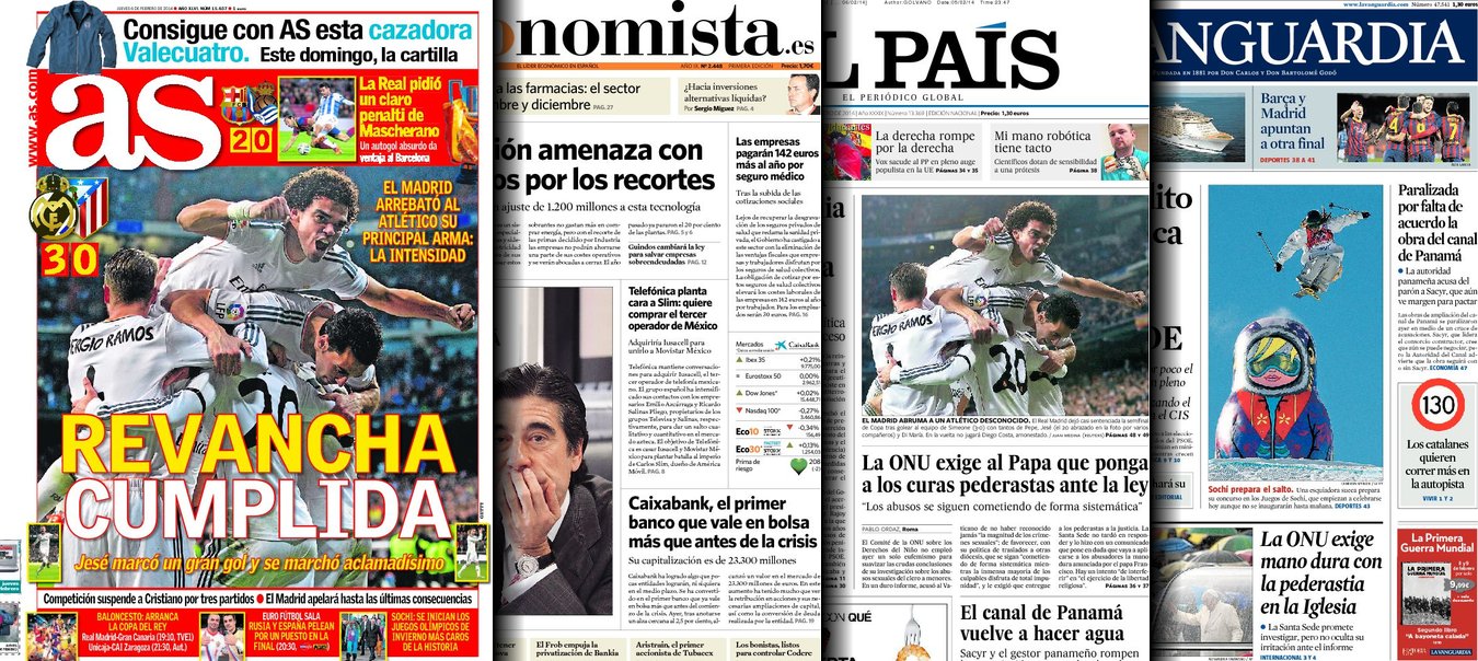 Portadas de los diarios El Mundo, El País, ABC, La Razón, La Vanguardia, El Periódico, Cinco Días, El Economista, Expansión, Marca, As, Mundo Deportivo y Sport.
