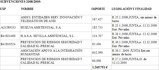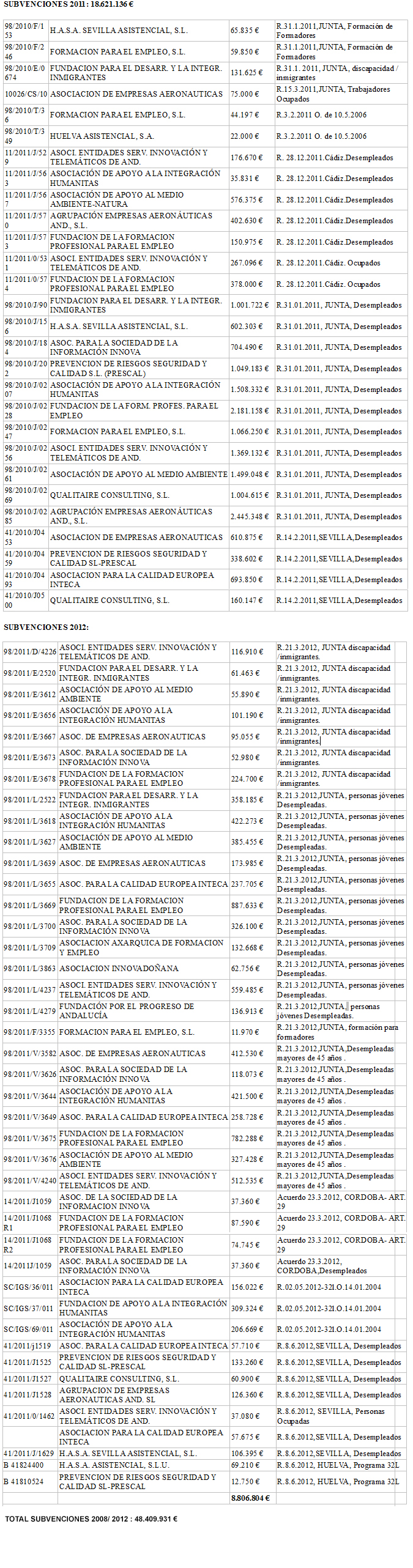 ASOCIACION DE APOYO A LA INTEGRACIÓN HUMANITAS -G 91761791-, constituida el 1/1/2009, domicilio c/Ebro,2, Sevilla, y que por Resolución de 30/1/2009, es decir, el mismo mes de su creación, y quizás sin estar aun inscrita y por supuesto, sin alta en SS, se le concede la primera subvención de 642.390€. Esto ya sería suficiente para intuir una cierta irregularidad. Desde luego, el criterio de la experiencia en formación -valorable para obtener la subvención- tampoco lo tenía en ese momento, pero es que ni siquiera existía jurídicamente en el periodo de la convocatoria.
