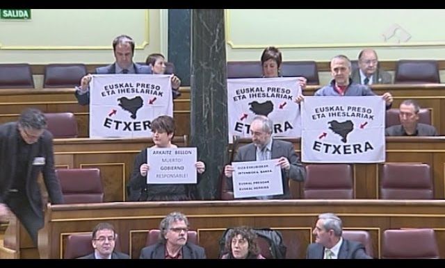 "Presos a casa" se leía en los carteles exhibidos por la formación proetarra que ha motivado la intervención del presidente de la cámara Jesús Posada. "¡Tíralo coño!" ha llegado a decir Posada tras dos llamadas al orden y una advertencia: "Si no los retiran procederé a expulsarles". Los 6 diputados de Amaiur presentes han retirado los carteles y ha comenzado la sesión de control.