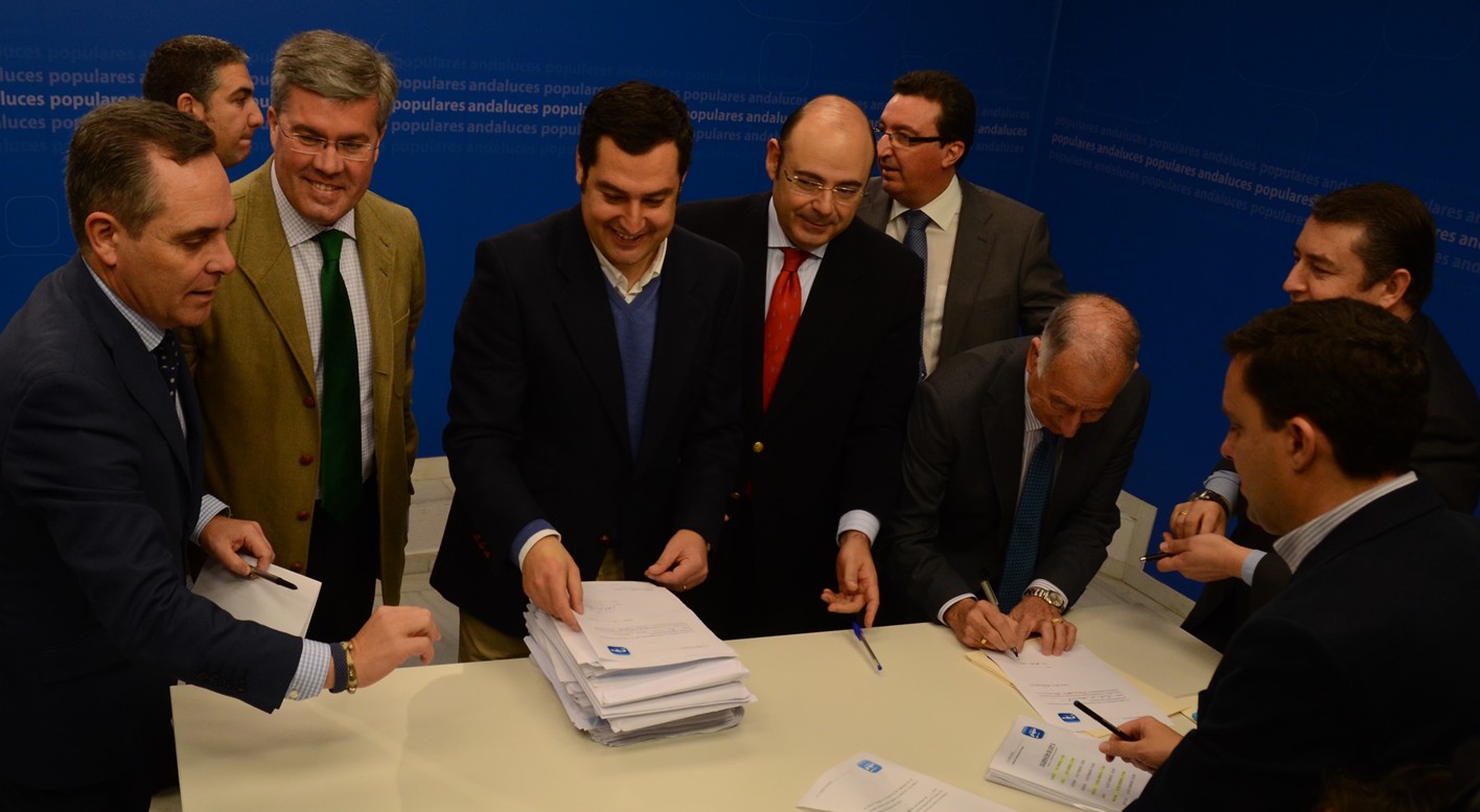 Fotografía de aparante unidad en Sevilla. Tras horas de enorme tensión con cruce de llamadas para evitar más de una candidatura, Juan Manuel Moreno Bonilla presentó sus avales -unos 9.000, recogidos en las últimas 24 horas- rodeado de los 8 presidentes provinciales de Andalucía. "Queremos forjar un gran consenso. Nadie sobra, todos somos importantes", proclamó el elegido por Mariano Rajoy. Sólo minutos antes, José Luis Sanz anunciaba a través de una nota de prensa su decisión de retirarse al constatar que no tenía el apoyo del líder.