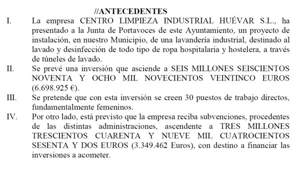 En la referencia del Consejo de Gobierno de 28 de junio de 2004, la Junta anunció que "ha ratificado la concesión de una ayuda de 2,3 millones de euros, por parte del Instituto de Fomento de Andalucía -IFA-, para respaldar la puesta en marcha de la empresa Centro de Limpieza Industrial Huévar, S.L., que creará 34 puestos de trabajo indefinidos en la localidad sevillana de Lebrija". Pero inicialmente la empresa iba a localizarse en Huévar -Sevilla- y de ahí el nombre de la entidad. Sin embargo, por razones cuya justificación no se encuentra, la Junta decidió que la empresa se trasladara a la ciudad de Lebrija donde gobernaba entonces el Partido Andalucista. Según fuentes de este partido, todo fue parte de una maniobra electoral para lograr la victoria en las siguientes elecciones.