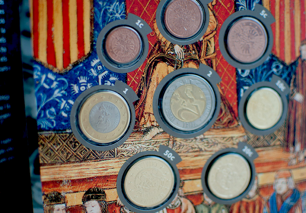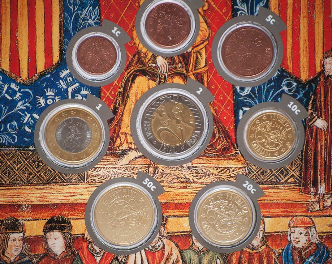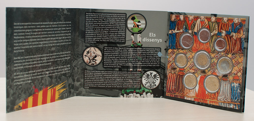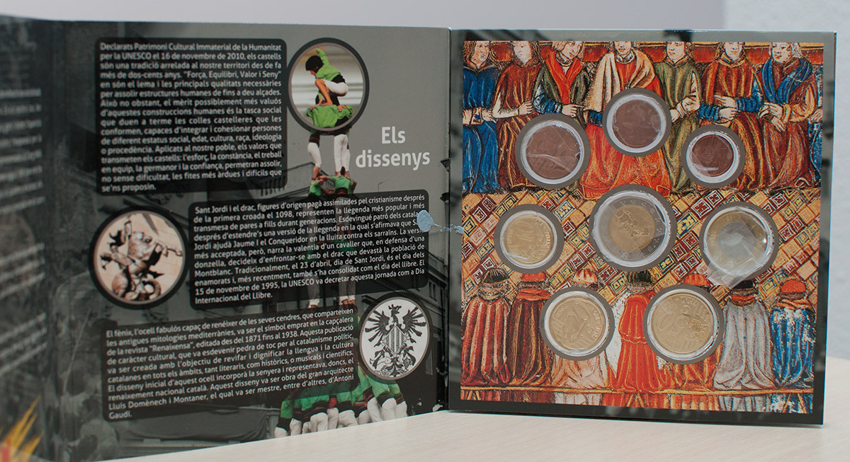 Estuche en el que se presentan las ocho monedas de euro falsas con motivos catalanes