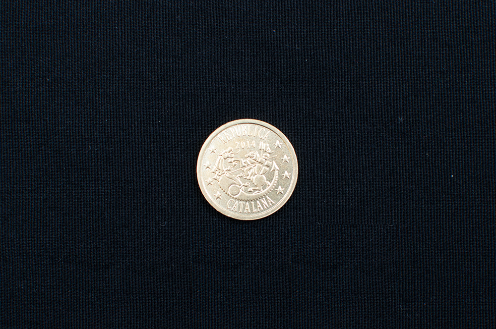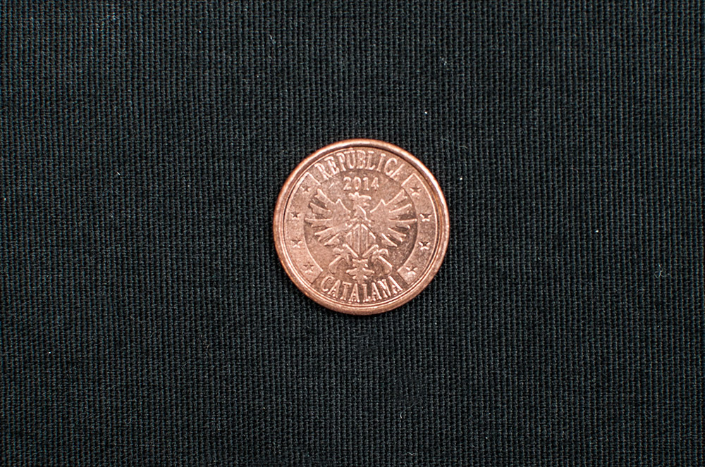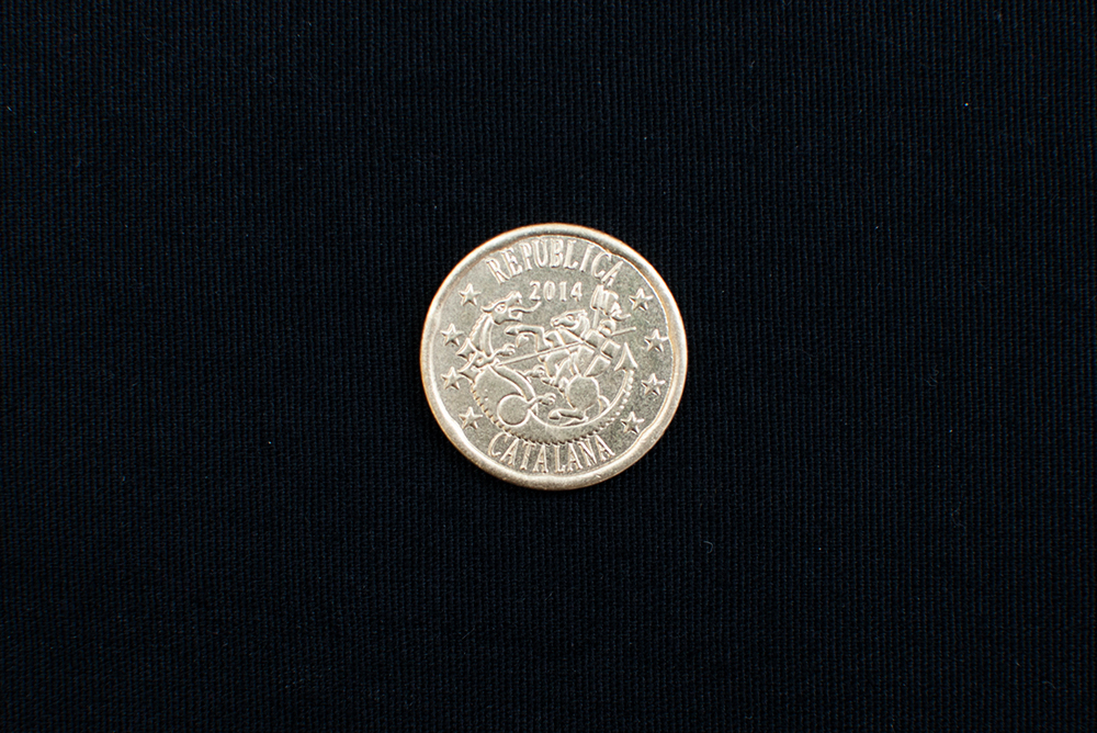 En la parte superior se puede ver la réplica separatista de la moneda de un céntimo. Poniendo atención, descubrimos que hay ligeras diferencias en la disposición de las barras que quedan tras la bola del mundo y que puede leerse, la palabra "prova".