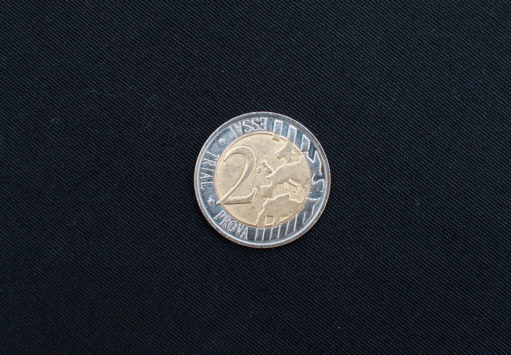 Como en las de anteriores cantidades, la réplica falsa de la moneda de 2 euros, presenta la misma variante tras el mapa de Europa