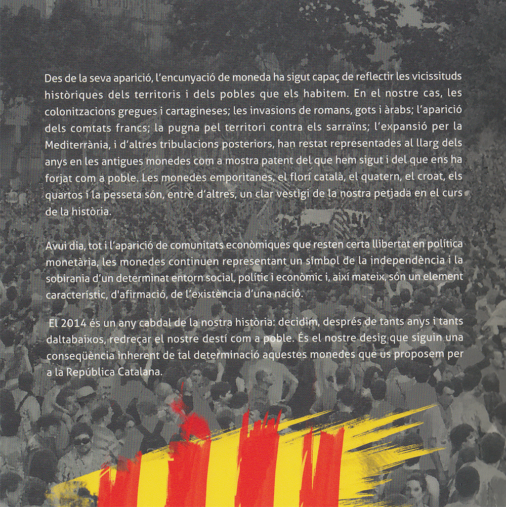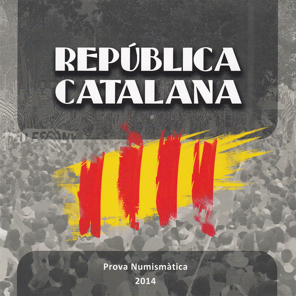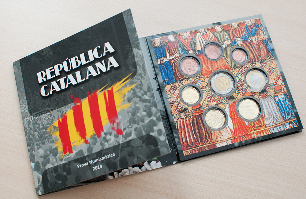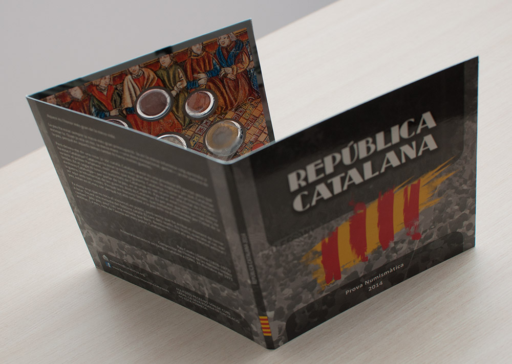 Estuche en el que se venden los euros falsos de la "República catalana", como dice en la carátula. En la parte central vemos los tres motivos que se emplean en las monedas.