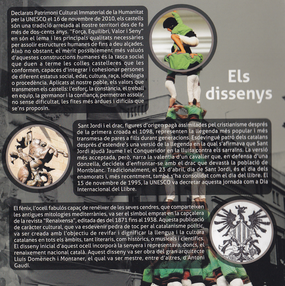 En la serie de monedas de 10, 20 y 50 céntimos, el motivo que sustituye a la cara del Rey es el de San Jordi matando al dragón