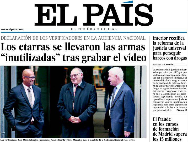 El País escoge una foto de los tres verificadores partiéndose de risa tras declarar ante el juez. "Los verificadores Ram Manikkalingam (izquierda), Ronnie Kasrils y Chris Maccbe, ayer a la salida de la Audiencia Nacional", dice el escueto pie de foto.