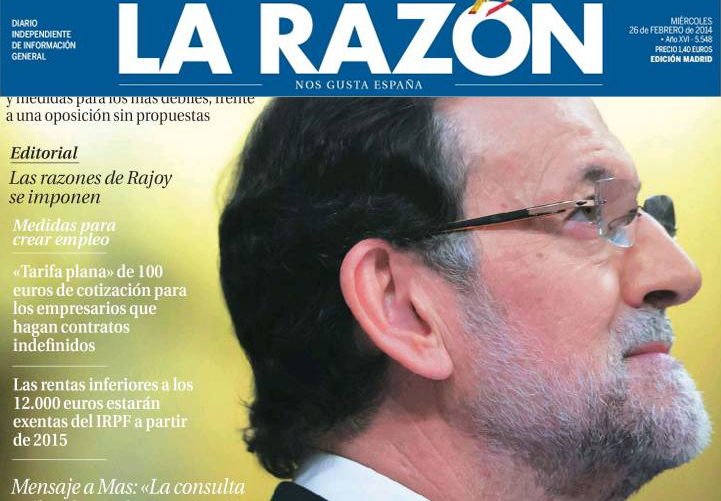 La Razón lleva una foto de Rajoy durante su intervención en el Congreso en la que el presidente mira al horizonte como si hubiera tenido una visión. Su rostro concentrado recuerda a aquellos posters con parejas contemplando una puesta de sol que decían: 'Si lloras porque se oculta el sol, las lágrimas te impedirán ver las estrellas'.