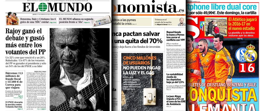 Portadas de los diarios El Mundo, El País, ABC, La Razón, La Vanguardia, El Periódico, Cinco Días, El Economista, Expansión, Marca, As y Sport.