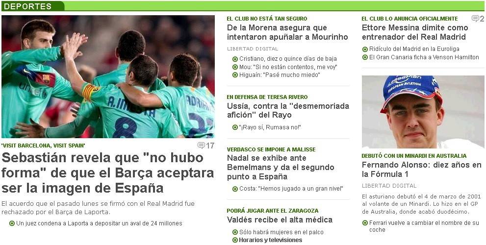 Tal día como hoy, 4 de marzo, pero de 2011, Libertad Digital contaba en su portada la negativa del Barcelona a ser imagen de España. Así lo reveló el entonces ministro de Industria y Turismo, Miguel Sebastián días después de firmar un acuerdo con la Comunidad de Madrid, el Ayuntamiento de la capital y con el presidente del Real Madrid para la promoción de España a través del club blanco.