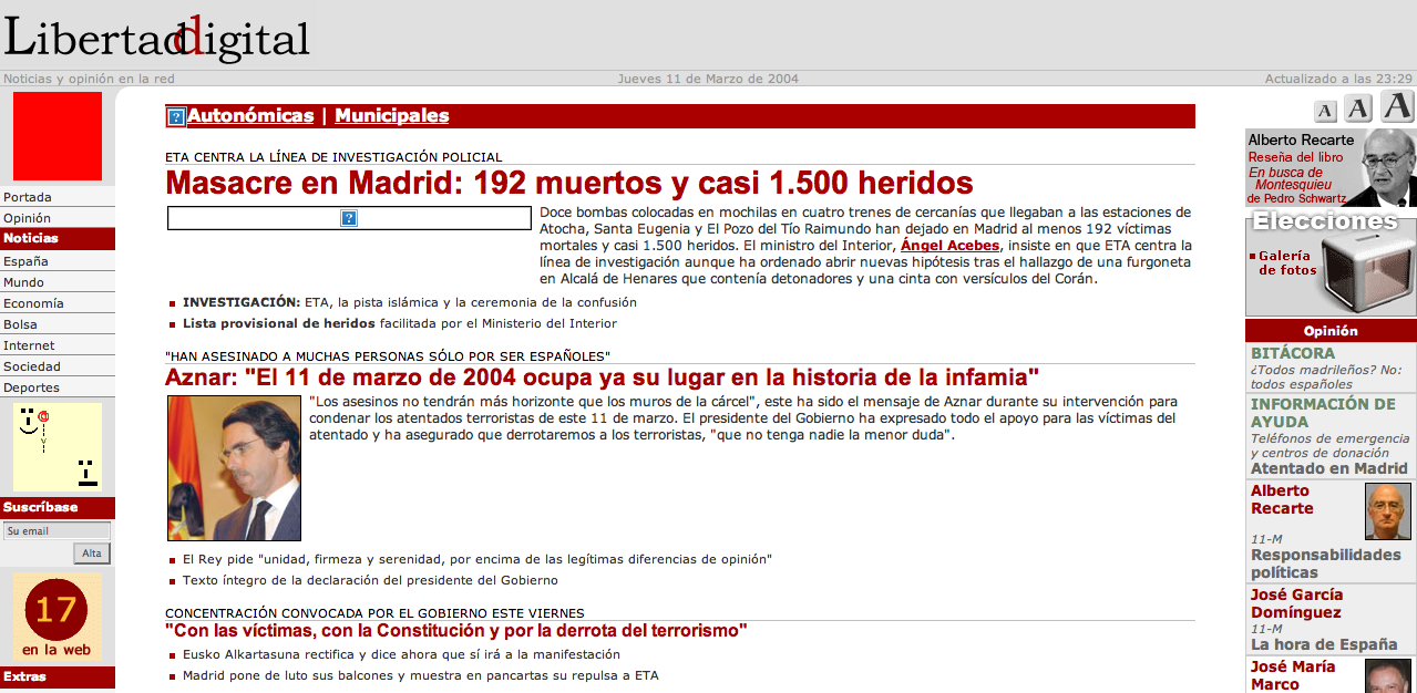 Tal día como hoy, 11 de marzo, pero de 2004, Libertad Digital dedicaba su portada única y exclusivamente al mayor atentado que ha sufrido España en toda su historia: "Masacre en Madrid: 192 muertos y casi 1.500 heridos". Era el trágico balance facilitado por el ministro del Interior. Además, Ángel Acebes añadió que las bombas colocadas en cuatro trenes estaban repartidas en "12 mochilas; 10 de ellas con entre 8 y 10 kilos de explosivos y otras dos con 11 ó 12 kilos, es decir, más de 100 kilos, dinamita en su mayor parte".