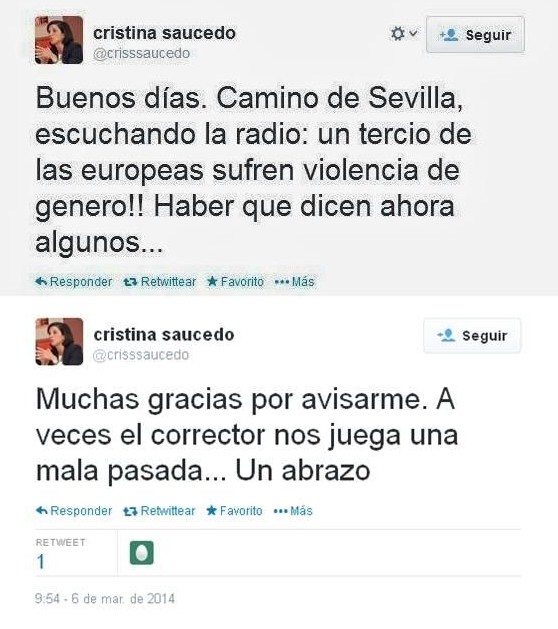 Muy indignada, Cristina Saucedo escribió: "Camino de Sevilla, escuchando la radio: ¡un tercio de las europeas sufren violencia de genero (sic)! Haber (sic) que (sic) dicen ahora algunos..." La garrafal falta de ortografía -"haber" por "a ver", además de la ausencia de tilde en el pronombre interrogativo "qué" y en "género"- no tardó en chirriar a los usuarios de esta red social, que se apresuraron a guardar el comentario y afearle a la delegada de Educación sus lagunas ortográficas.