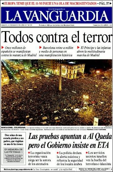 Todos contra el terror, el titular de La Vanguardia sobre los miles de ciudadanos en la plaza de Atocha.