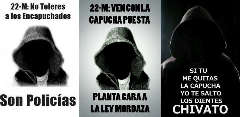 Así, desde la cuenta @BasuraDeEstado se alertaba de que es necesario "plantar cara a la ley mordaza" y para ello nada mejor que ir "con la capucha puesta". Algunos aseguran que es indiferente porque los policías estarán infiltrados "con y sin capucha", como el usuario V9 Zothal, que además tiene el detalle de alertar contra la prensa: "#Ojo a los 'Cucas' prensa q hace d informante d la #gestapo".