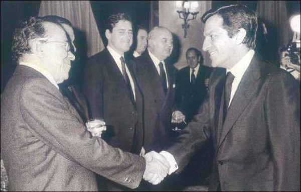 Suárez y Carrillo estrechan sus manos durante una reunión en la Transición