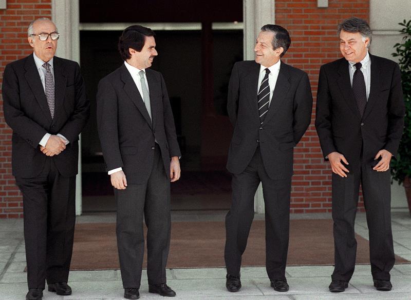 Fotografía de archivo (Madrid, 13/06/1997) del entonces presidente del Gobierno, José María Aznar, con los anteriores presidentes constitucionales, Leopoldo Calvo Sotelo, Adolfo Suárez y Felipe González, en el Palacio de la Moncloa