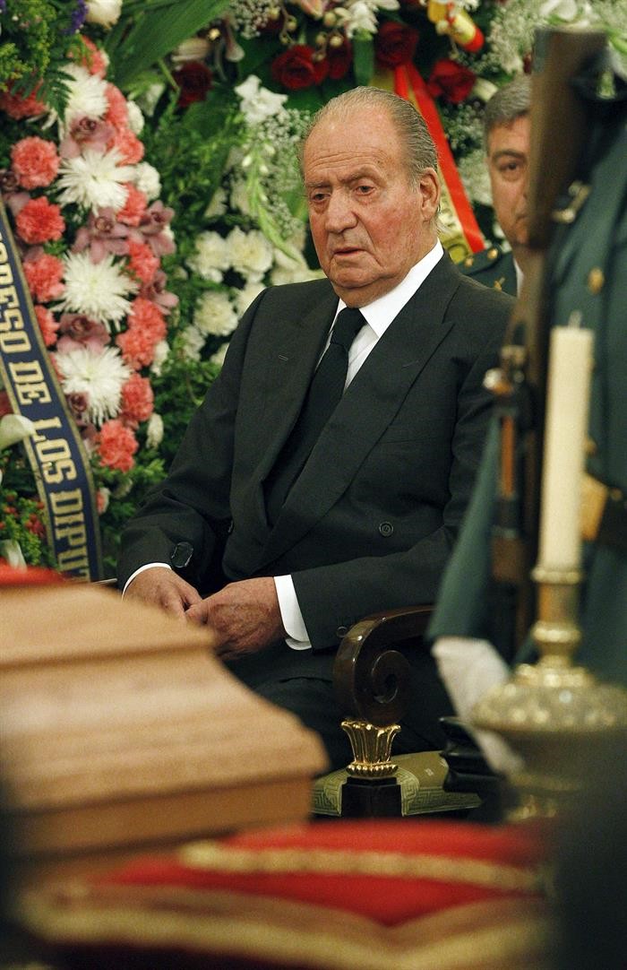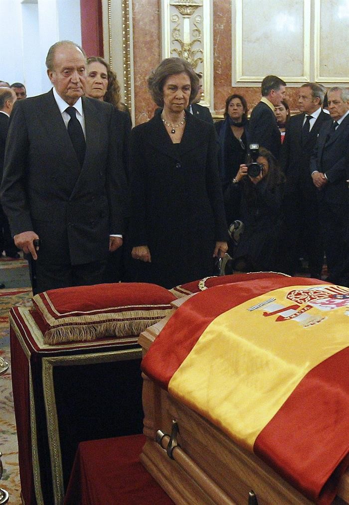 El Rey, con el rostro serio y entristecido ante el féretro de Suárez