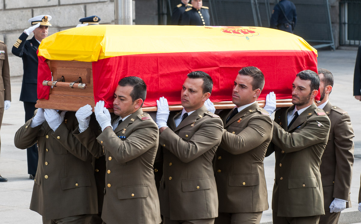 El féretro pasa ante los soldados de la Guardia Real, al fondo se puede ver el numeroso público que ha seguido la ceremonia