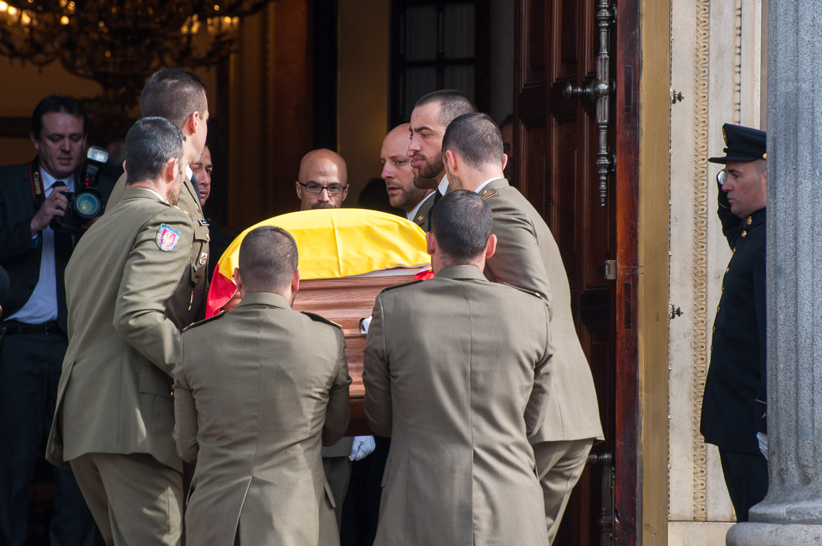 El féretro, a hombros de varios soldados, enfila la escalera del Congreso con las autoridades a ambos lados
