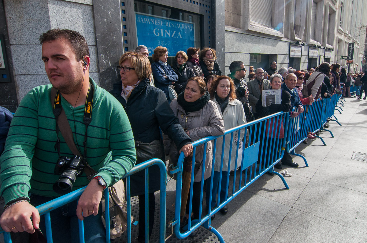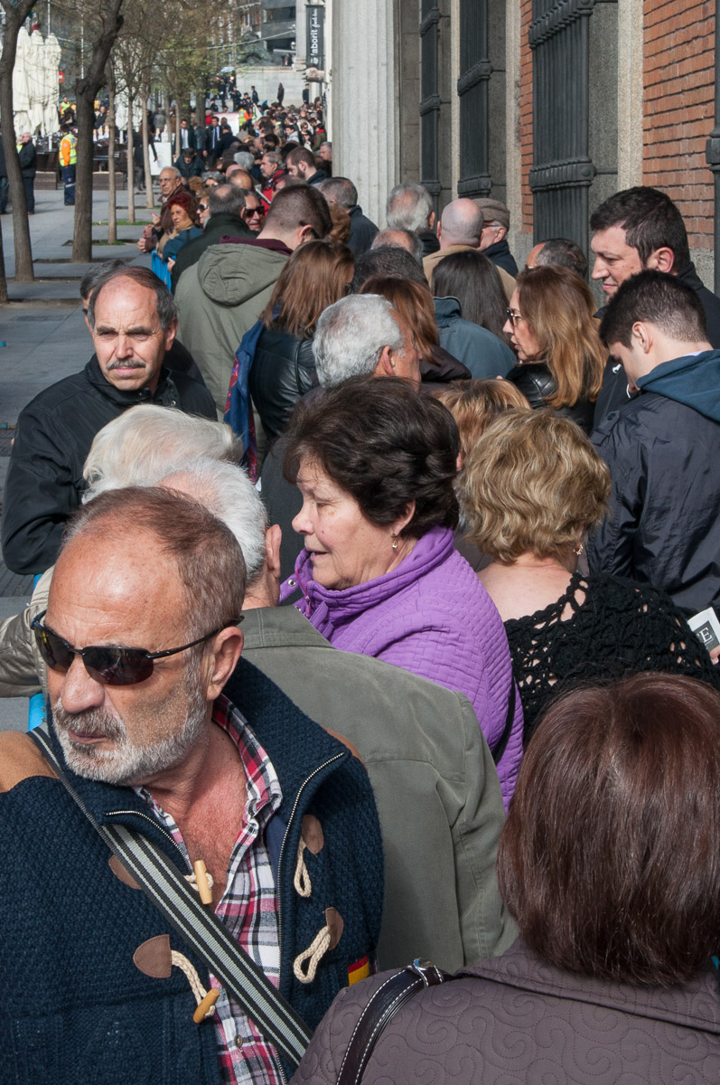 La fila de ciudadanos superaba la esquina con el Paseo del Prado y a las 10 de la mañana llegaba a la puerta del Museo Thyssen, unos cientos de metros más allá. Los primeros en llegar lo habían hecho a las 7 de la mañana