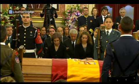 El presidente del Gobierno ha recibido el féretro de Adolfo Suárez en la Puerta de los Leones de la Cámara Baja. De ahí, con toda la comitiva, se dirigió al Salón de los Pasos Perdidos, donde ha quedado instalada la capilla ardiente del primer presidente de la democracia y donde el Rey ha impuesto a Suárez el Collar de la Real y Distinguida Orden de Carlos III.