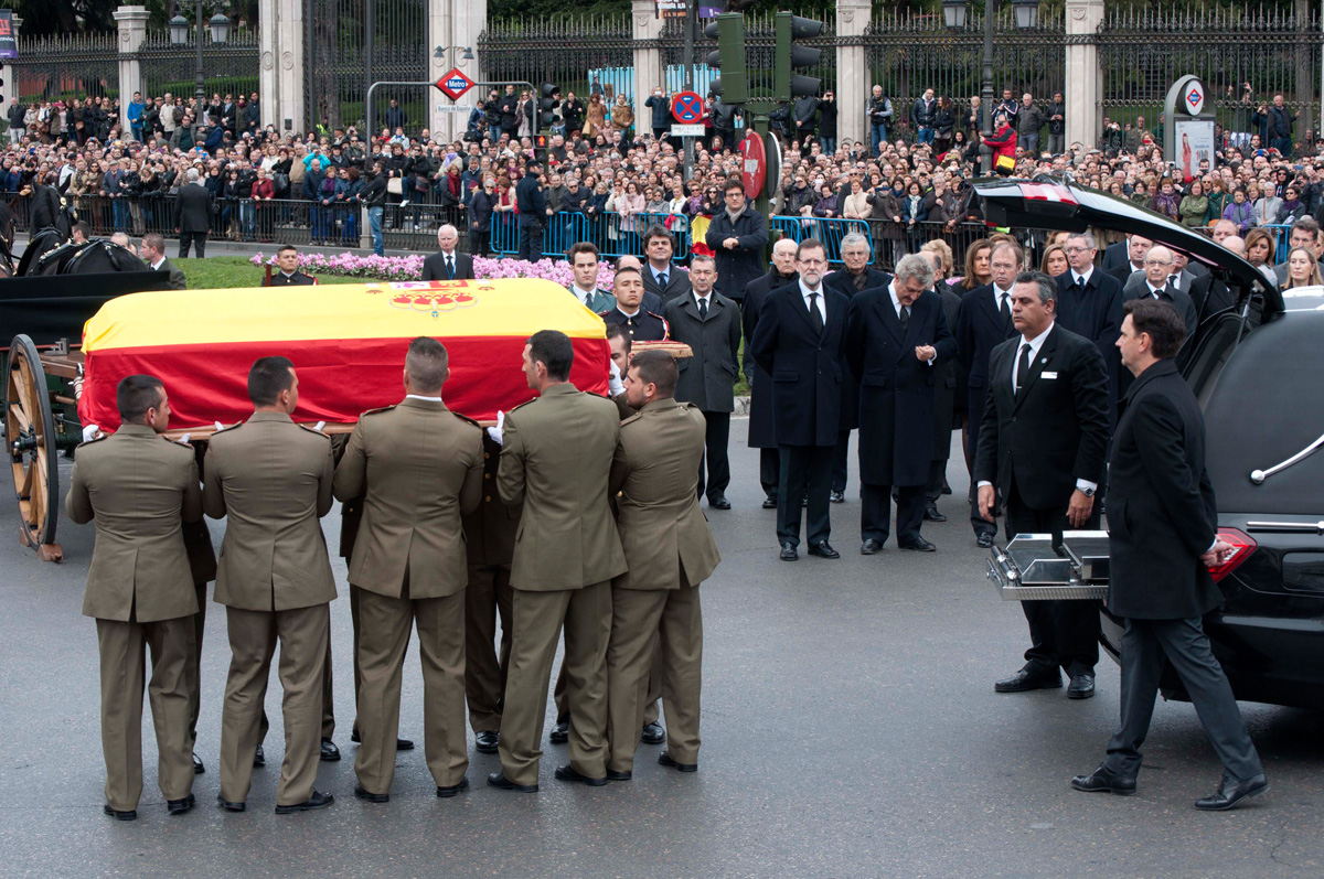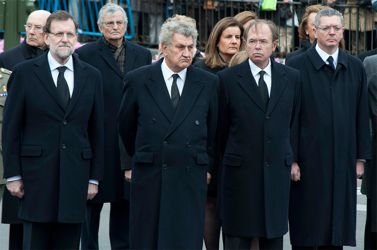 Alberto Ruiz Gallardón, Soraya Sáenz de Santamaría y el presidente del TC, Pérez de los Cobos, contemplan como el féretro es subido al carruaje