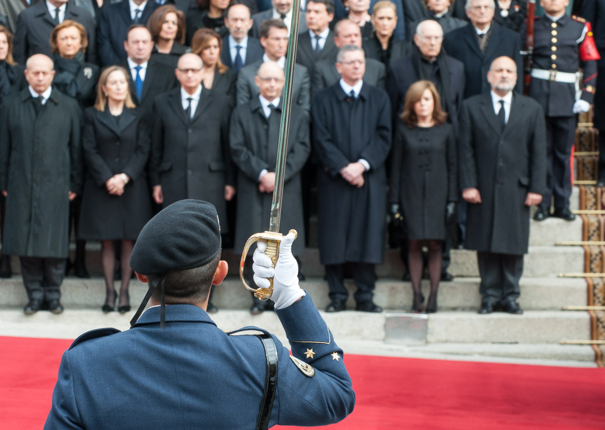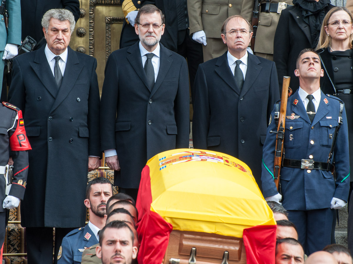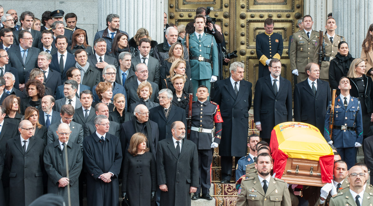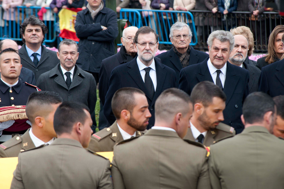 El presidente Rajoy, con los presidentes del Congreso y el Senado, encabezando la comitiva de representantes políticos y de las principales instituciones del Estado en la despedida de Adolfo Suárez