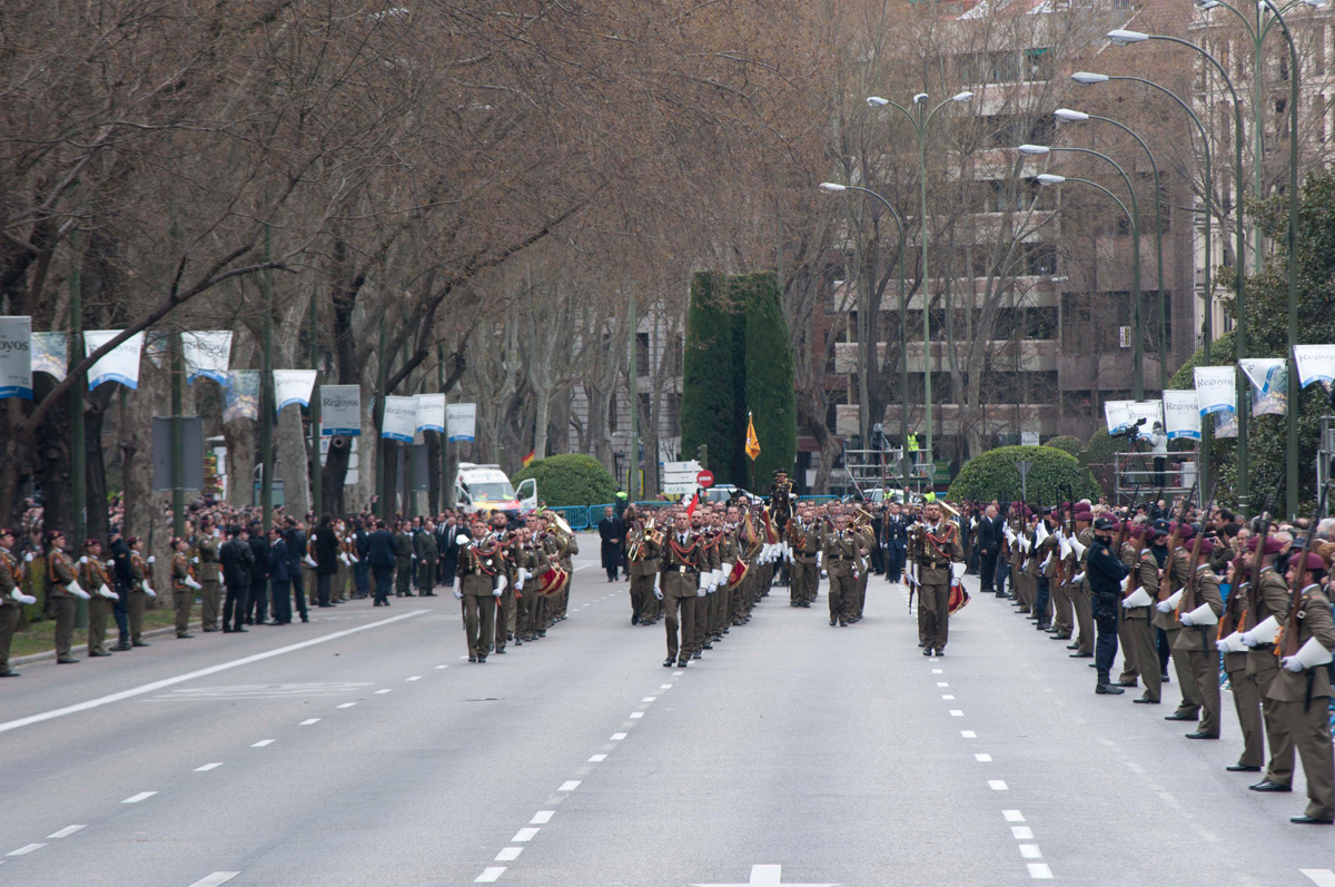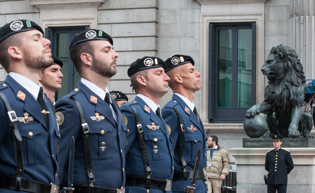 Algunos de los soldados que han participado en la parada militar pasan frente al Congreso