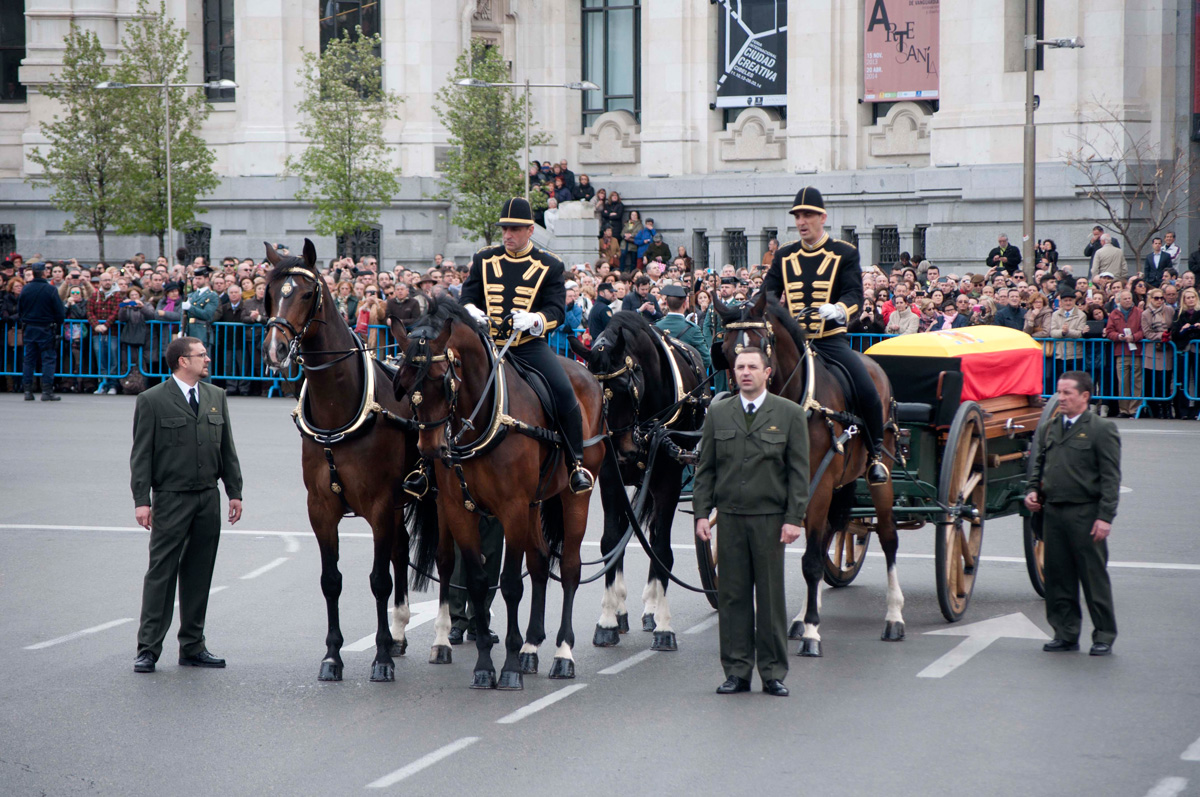 Comenzaba el proceso de cambio de vehículo, del carruaje real al coche fúnebre para su traslado a Ávila. Una representación de los tres Ejércitos y la Guardia Civil acompañan al féretro.